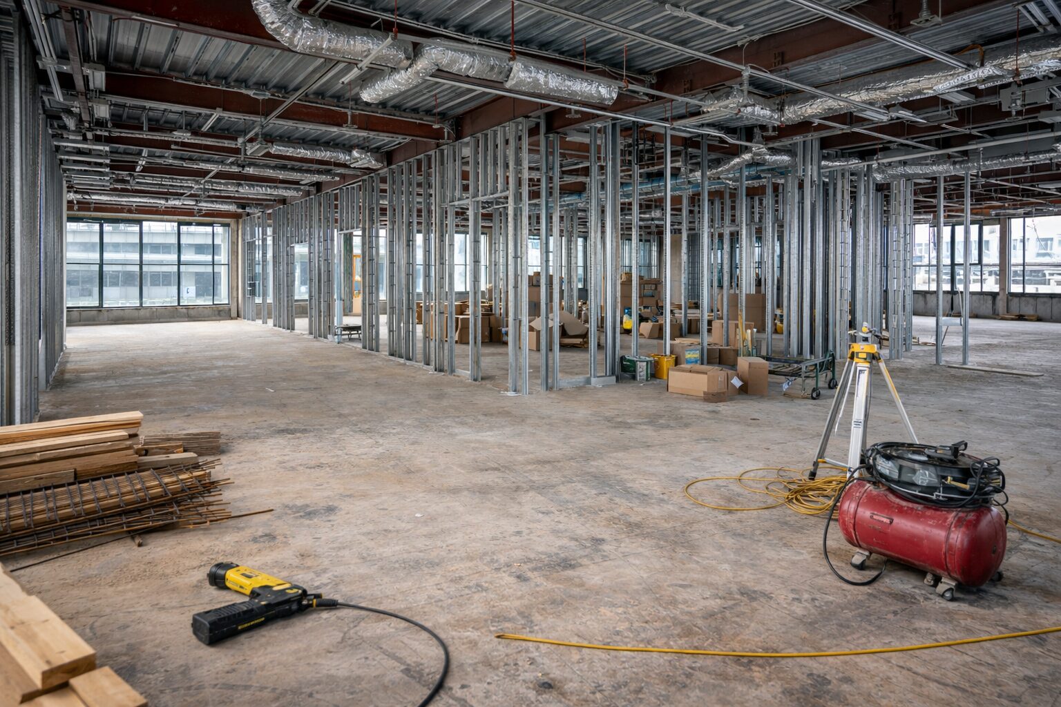 Completed drywall installation with flawless finishing for a commercial office space in Virginia.